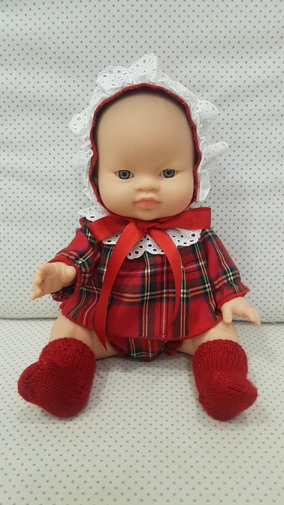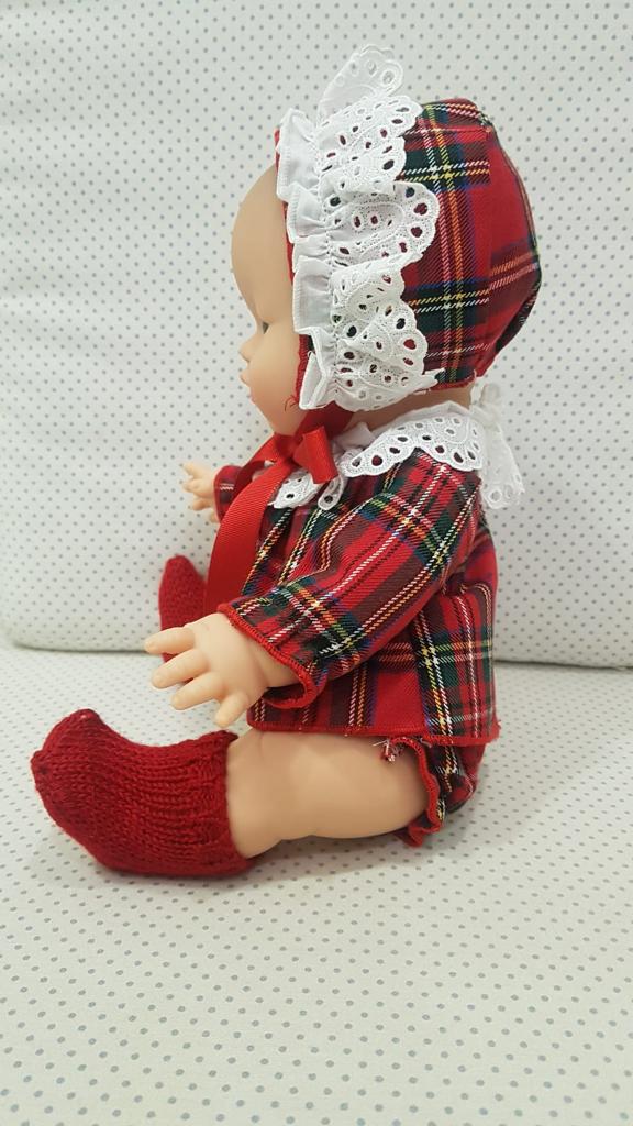 Se compone de muñeca de 33cm, jesusito, braguita, patucos y capota a juego.